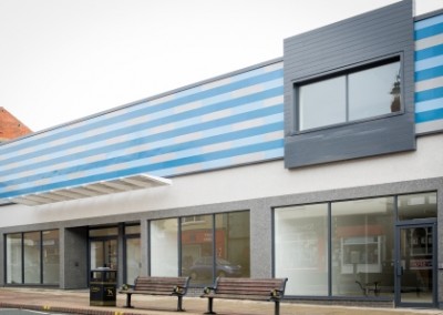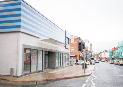The work involved the demolition of one property, building of a glazed single storey shop unit and complete refurbishment of the existing buildings. The buildings were completely stripped out, reroofed in a GRP covering, reskinned in rain screen cladding and aluminium doors/windows installed. At the rear of the building a new car park/delivery area was laid.